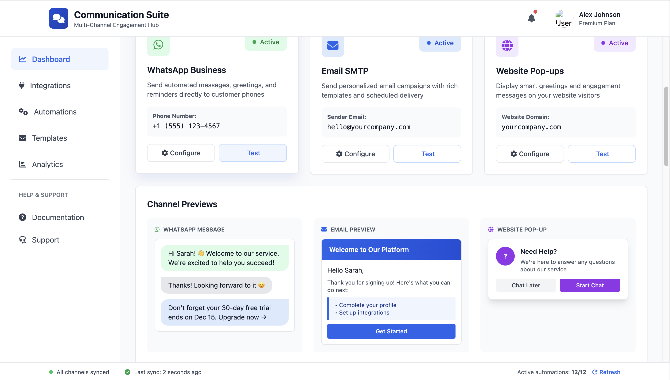 Seamless Integration Suite for Website, WhatsApp, and Emails featuring automated greetings and reminders via applicable channels.